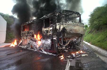 Un grupo armado atacó ayer a agentes federales, realizó bloqueos e incendió vehículos en Apatzingán y municipios aledaños, con saldo de al menos cinco presuntos delincuentes muertos y cinco policías heridos Foto Agencia Esquema
