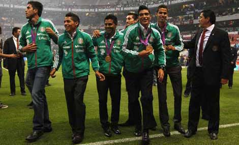 En un partido deslucido y para el olvido, la selección mexicana de futbol perdió 0-1 con su similiar de Estados Unidos. La escuadra nacional salió abucheada. Lo que causó algarabía entre los aficionados fue la presencia de algunos de los atletas nacionales que ganaron medallas en los Juegos Olímpicos de Londres 2012. La ovación estalló en el medio tiempo al observar en la cancha a los seleccionados Jesús Corona, Héctor Herrera, Javier Cortés, Raúl Jiménez, Diego Reyes, Javier Aquino y Néstor Araujo, así como al entrenador Luis Fernando Tena. También acudieron Paola Espinosa, Alejandra Orozco, María del Rosario Espinoza, Germán Sánchez, Iván García y Aída Román Foto Francisco Olvera