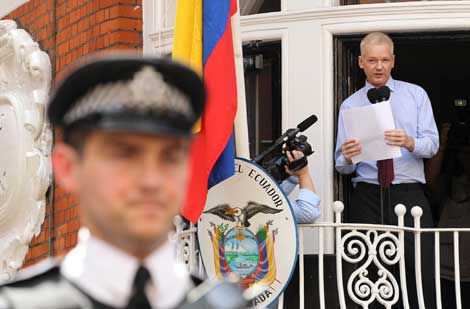 Julian Assange, fundador de Wikileaks, leyó ayer un mensaje desde un balcón de la embajada de Ecuador en Londres –en la que que se refugió desde el 19 de junio para evitar su extradición a Suecia–, en el cual criticó a Estados Unidos por amenazar la libertad de expresión. El australiano agradeció al presidente Rafael Correa por haberle concedido asilo político, así como la solidaridad de numerosos países latinoamericanos Foto Reuters
