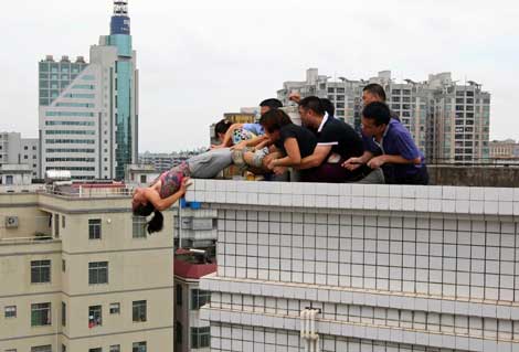 Rescatistas y familiares sostienen a una mujer que intenta arrojarse de un edificio de nueve pisos en la ciudad china de Zhanjiang, provincia de Guangdong. Minutos antes, ella había discutido acaloradamente con su cuñada; como resultado de la disputa familiar ahogó a un pequeño y lo lanzó por un tejado para luego buscar el suicidio. El grupo que la salvó desconocía los hechos Foto Reuters