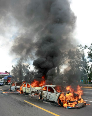 Sujetos armados bloquearon ayer accesos carreteros de Jalisco con al menos 35 vehículos, 15 de los cuales fueron incendiados. Los hechos ocurrieron tras un enfrentamiento en el municipio de Tonaya, en el que murieron seis presuntos delincuentes Foto Arturo Campos