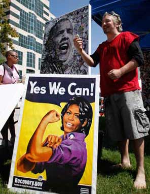 El diseñador gráfico O puso a la venta litografías con las imágenes de Barack Obama y su esposa Michelle frente al auditorio donde se realizará la Convención Nacional Demócrata, en Charlotte, Carolina del Norte. En esa ciudad, cientos de personas marcharon ayer para protestar contra el sistema bipartidista estadunidense, al que culpan de privilegiar a la banca antes que a los ciudadanos Foto Reuters