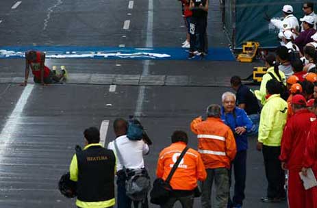 El ganador Peter Lamayian Nkaya se desploma luego de cruzar la meta frente al Zócalo capitalino, con cronometraje de 2:15.53 horas. El mejor fondista mexicano fue Erick Israel Pérez, quien terminó en séptimo puesto. En mujeres, la etiope Shewarge Alene Amare fue la triunfadora; la nacional Martiza Arenas quedó en terce lugar. Uno de los competidores, Juan Pablo de la Mora Ocaña, de 33 años, falleció en el Hospital de Balbuena luego de solicitar auxilio al concluir su participación Foto Cristina Rodríguez