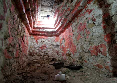 Entrada a la cámara funeraria descubierta a siete metros de profundidad en el templo XX de la zona arqueológica de Palenque, Chiapas. Los primeros indicios de la habitación abovedada, de 3.40 metros de largo, 1.43 de ancho y 2.50 de altura, se remontan a 1999. Sin embargo, la inestabilidad del sitio y lo intrincado de su ubicación, causaron, entre otros motivos, que las investigaciones se interrumpieran durante varios años. En las paredes se observan restos de un mural y vasijas en el piso Foto Yazmín Ortega Cortés