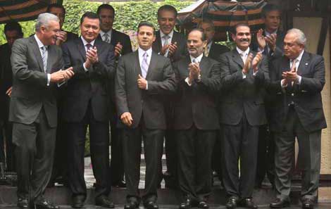 El presidente electo Enrique Peña Nieto y gobernadores del PAN, así como el dirigente de esa organización política, Gustavo Madero, se reunieron ayer para ofrecerse mutua colaboración institucional y abordar temas de la agenda nacional. Consideraron que es imperativo reconocer que la contienda electoral quedó atrás y, a partir de ello, construir una relación que funcione en favor de los ciudadanos Foto José Antonio López