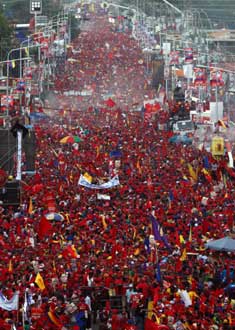 Simpatizantes del presidente Hugo Chávez en un acto de campaña en Cabimas (izquierda), en el estado de Zulia. El jueves, el mandatario realizará una concentración en Caracas, en vísperas de la elección del domingo. Henrique Capriles Radonski, su principal oponente, encabezó un cierre multitudinario en la capital venezolana.