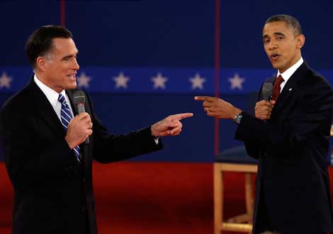 Los candidatos presidenciales Mitt Romney y Barack Obama durante el segundo debate, realizado en la Universidad Hofstra, en Long Island. Antes de este encuentro, los aspirantes estaban en