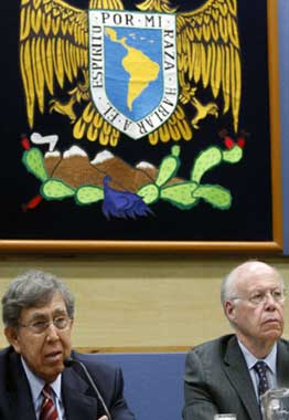 Cuauhtémoc Cárdenas y el rector José Narro, integrantes del grupo Hacia un Nuevo Curso de Desarrollo, durante la presentación del documento Lineamientos de política de crecimiento sustentable y la protección social. En el equipo de políticos y especialistas también están David Ibarra, Jesús Silva Herzog, Rolando Cordera, Francisco Suárez Dávila, Enrique del Val, Jaime Ros y Eugenio Anguiano, entre otros Foto Guillermo Sologuren