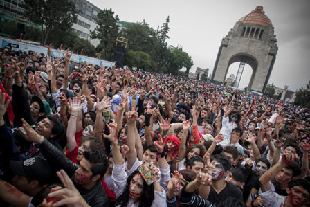 Al menos 15 mil personas, maquilladas con color similar a la sangre y con la ropa desgarrada, se dieron cita en la Plaza de la República para protagonizar la sexta Caminata Zombi, cuyo destino final fue el Zócalo capitalino Foto Xinhua