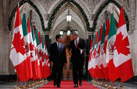 El presidente electo Enrique Peña Nieto y el primer ministro Stephen Harper se dirigen hacia una conferencia de prensa, tras abordar la agenda bilateral en la sede del Parlamento canadiense. Ambos resaltaron su interés por impulsar la formación de la Alianza Transpacífico, así como estimular la creación de empleos en el marco del Tratado de Libre Comercio de América del Norte. El visitante mexicano solicitó eliminar las visas que exige ese país a connacionales. También convinieron en analizar los temas de seguridad Foto Reuters