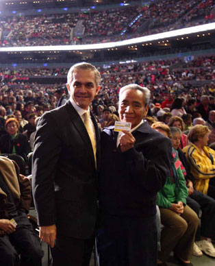El jefe de Gobierno del Distrito Federal, Miguel Ángel Mancera, entregó ayer 11 mil tarjetas de la pensión alimentaria y anunció que a partir de enero próximo habrá nuevos programas sociales en beneficio de los adultos mayores Foto Notimex