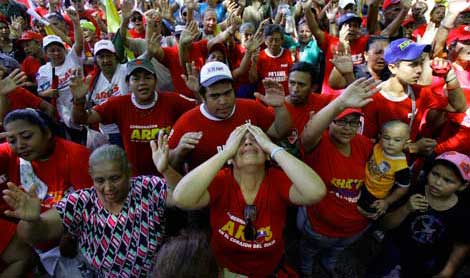 Miles de seguidores del mandatario se reunieron en plazas de la principales ciudades y pueblos de Venezuela (Maracaibo, en la imagen) para expresarle su solidaridad, luego de que éste anunciara un rebrote de cáncer en su abdomen. La Asamblea Nacional autorizó que se ausente del país por más de cinco días con el fin de someterse a una nueva intervención quirúrgica en Cuba. Esto ocurre un mes antes de que comience un nuevo periodo presidencial de seis años. Los gobiernos de México, Ecuador, Bolivia y Chile le enviaron mensajes de aliento Foto Reuters