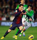 Con doblete en la victoria de 2-1 del Barcelona sobre Betis, La Pulga se convirtió en el máximo romperredes del mundo, en un año natural, al llegar a 86 goles y superar al alemán Gerd Müller Foto Reuters