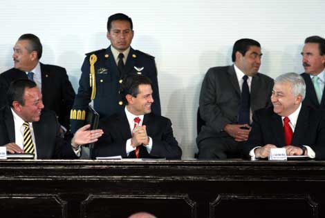 Con la ausencia de la lideresa nacional del magisterio, Elba Esther Gordillo, el presidente Enrique Peña Nieto entregó una iniciativa de reforma al artículo tercero constitucional para reafirmar la rectoría del Estado sobre la política educativa nacional. Dirigentes y líderes parlamentarios firmaron como testigos de honor, en un acto realizado en el Museo Nacional de Antropología Foto María Luisa Severiano