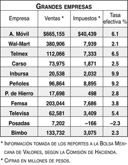Algunos miembros de la Comisión de Hacienda de la anterior legislatura prepararon un reporte sobre algunas grandes empresas que pagan un porcentaje muy pequeño de impuestos en relación con sus ventas. Hay otro modo de calcularlo, mediante la relación de utilidades e impuestos. De cualquier modo, la información que presenta la gráfica de 2011 es útil.