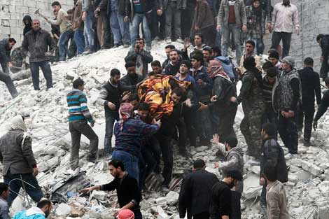 Cuatro días después del ataque, el ministro israelí de Defensa, Ehud Barack, dijo que esto es una prueba de que cuando decimos una cosa es en serio, al referirse al bombardeo en Yamraya, localidad cercana a la carretera Beirut-Damasco, donde se localizan instalaciones militares sirias. En la imagen, civiles rescatan un cadáver tras la ofensiva del gobierno de Bashar Assad sobre zonas opositoras en Ansari Foto Ap
