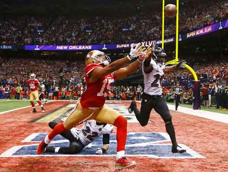 El receptor de San Francisco, Michael Crabtree (15), no pudo atrapar el pase que hubiera dado la voltereta al marcador de 34-29 a favor de la Cuervos de Baltimore, cuando faltaban 1:50 minutos en el último cuarto. Los californianos alegaban falta en esa jugada Foto Reuters