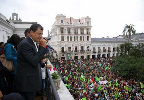 El presidente ecuatoriano Rafael Correa salió a un balcón del Palacio Nacional de Carondelet a dar su discurso triunfal tras conocerse los sondeos a boca de urna que le daban una enorme ventaja sobre sus adversarios en la primera vuelta electoral. En rueda de prensa dedicó su victoria al mandatario venezolano Hugo Chávez Foto Reuters