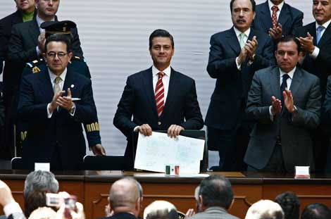 El presidente Enrique Peña Nieto, durante el acto en Palacio Nacional de promulgación de la reforma educativa. El mandatario puntualizó que el esquema de evaluación magisterial, incluido en la enmienda, no pretende exhibir a nadie. Al encuentro acudieron los dirigentes de PRI, PAN y PRD, así como representantes de las cámaras de Diputados y Senadores Foto Cristina Rodríguez