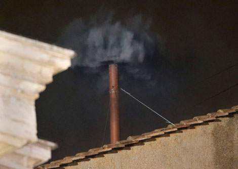 Un espeso humo negro salió ayer de la chimenea de la Capilla Sixtina tras la primera votación de los 115 cardenales electores. El cónclave terminará con la fumata blanca que anuncie la designación del sucesor de Benedicto XVI Foto Reuters
