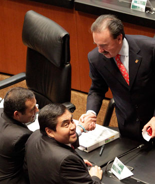 El priísta Emilio Gamboa Patrón saluda al panista Ernesto Cordero, con el perredista Miguel Barbosa al lado. Los tres coordinadores de sus respectivas bancadas en el Senado dieron ayer sus puntos de vista sobre la iniciativa de reforma en materia de telecomunicaciones enviada por el presidente Enrique Peña Nieto. Adelantaron que se reunirán con el titular de la SCT, Gerardo Ruiz Esparza, y expertos para ahondar sobre el tema Foto Yazmín Ortega Cortés