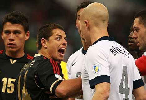 Javier El Chicharito Hernández y el estadunidense Michael Bradley se encaran durante el encuentro del hexagonal final de la Concacaf, rumbo a la Copa del Mundo Brasil 2014 Foto Jam Media