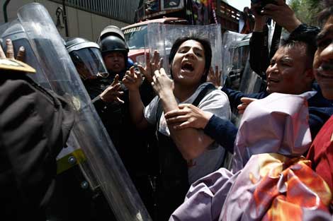 Granaderos y comerciantes se enfrentaron cuando estos últimos intentaron ingresar un camión torton al Zócalo, en el que llevaban una maqueta del mercado, productos podridos y cinco toneladas de frutas y verduras para regalar. Los locatarios dijeron que ‘‘a un mes del incendio ocurrido en la nave mayor del inmueble no hemos tenido apoyo alguno de las autoridades capitalinas, mientras nuestras ventas cayeron 80 por ciento. Por eso traíamos esos regalitos para el jefe de Gobierno Miguel Ángel Mancera’’ Foto Cristina Rodríguez