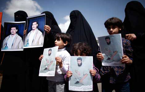 Unos 130 presos sospechosos de terrorismo mantienen el ayuno iniciado hace ocho semanas en protesta por los abusos a que son sometidos en la cárcel estadunidense ubicada en Cuba, aseguró uno de los defensores. Agregó que 66 reos del bloque llamado Campo V se sumaron al movimiento. El Pentágono sólo reconoce que hay 39 reclusos en huelga de hambre, del total de 166. A 11 los alimentan por la fuerza a través de sondas. En la imagen, familiares de internos realizaron un plantón en Saná, Yemen, frente a la embajada de Estados Unidos Foto Reuters