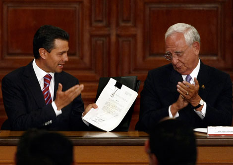 El presidente Enrique Peña Nieto entrega la nueva Ley de Amparo al ministro presidente de la Suprema Corte de Justicia de la Nación, Juan Silva Meza, durante el acto de promulgación de la normativa, realizado ayer en Palacio Nacional Foto Cristina Rodríguez