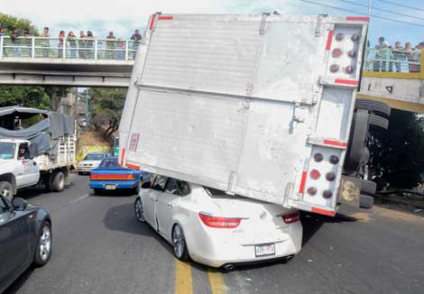 Un camión tipo torton que transportaba muebles se estrelló con un puente peatonal y volcó sobre un automóvil particular, a la altura de la colonia San Andrés Totoltepec, delegación Tlalpan. Ambos conductores salieron ilesos y fueron atendidos por paramédicos Foto Cuartoscuro