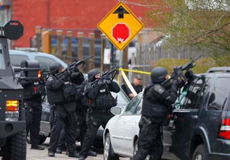 Policías se despliegan en Watertown, Massachusetts, durante la búsqueda de los sospechosos del ataque con bombas en el maratón de Boston, luego de que la FBI difundió las imágenes de los presuntos responsables, los hermanos Dzhokhar y Tamerlan Tsarnaev, de origen checheno. El gobierno de Chechenia instó a no vincular a esa ex república soviética con el atentado Foto Reuters