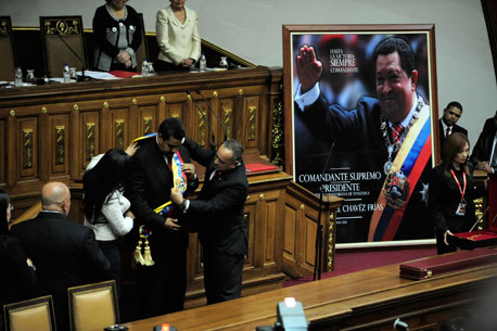 María Gabriela Chávez, hija del extinto Hugo Chávez, y Diosdado Cabello, presidente de la Asamblea Nacional venezolana, imponen la banda presidencial a Nicolás Maduro, durante la ceremonia de asunción para el periodo 2013-2019 Foto Xinhua