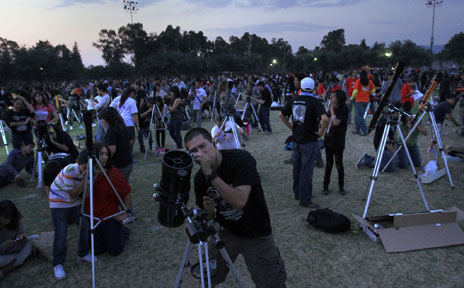 Con 2 mil 978 telescopios instalados en 40 sedes en todo el país, se consiguió la marca del mayor número de personas que observaron la Luna al mismo tiempo. La imagen fue captada afuera del Planetario del IPN Foto María Luisa Severiano