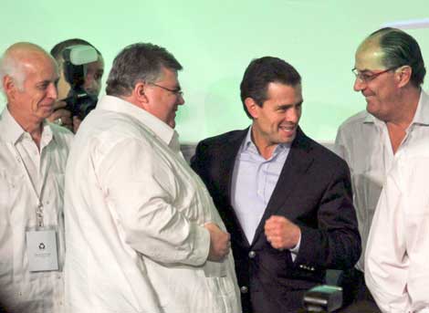 El presidente Enrique Peña Nieto inauguró ayer la 76 Convención Nacional Bancaria. En la imagen lo acompañan Luis Niño de Rivera, director de Banco Azteca; Agustín Carstens, gobernador del Banco de México, y Jaime Ruiz Sacristán, presidente saliente de la ABM Foto María Luisa Severiano