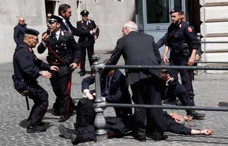 Un hombre identificado como Luigi Preiti, de 49 años, atacó a guardias que vigilaban el Palacio Chigi, sede del gobierno en el centro histórico de Roma, en el momento en que se desarrollaba, a un kilómetro de distancia, la ceremonia de la toma de posesión del primer ministro Enrico Letta, en el Palacio del Quirinale. Dos policías y una mujer embarazada resultaron heridos.
