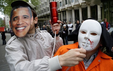 Grupos de activistas realizan una campaña internacional de tres días en apoyo a los internos en la cárcel de Guantánamo que el viernes cumplieron 100 días en huelga de hambre. En la imagen, captada en Londres, el activista con máscara de Barack Obama simula alimentar por la fuerza a una persona que representa a un prisionero en ayuno Foto Ap