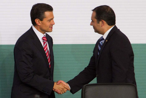 El presidente Enrique Peña Nieto saluda al panista Ernesto Cordero, quien ayer fue destituido del cargo de coordinador de su partido en el Senado. El legislador acudió a Palacio Nacional a la presentación del Plan Nacional de Desarrollo, en su calidad de presidente de la Cámara de Senadores Foto Notimex