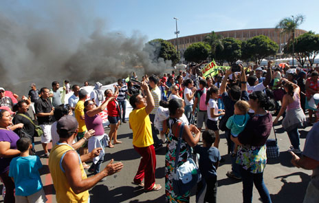 Cientos de personas protestaron ayer frente al estadio Nacional, en Brasilia, por el alza en el precio del transporte y los cuantiosos recursos públicos que se han destinado al Mundial de 2014 y la Copa Confederaciones, la cual arranca hoy con el encuentro entre la selección brasileña y la escuadra japonesa. La manifestación incluyó la quema de neumáticos y el bloqueo del inmueble Foto Ap