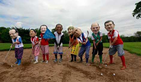 Los ocho países más ricos del mundo se comprometieron a endurecer sus posturas contra el lavado de dinero y la evasión fiscal, pero no hicieron propuestas específicas al término de su cumbre de dos días celebrada en Irlanda del Norte. En el terreno geopolítico, acordaron impulsar la formación de un gobierno de transición en Siria y aumentar la ayuda humanitaria para el país en guerra, pero el presidente ruso, Vladimir Putin, logró bloquear la petición de que renuncie el mandatario Bashar Assad. Activistas de Oxfam parodiaron a los participantes del encuentro Foto Reuters