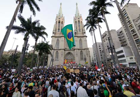 Decenas de miles de brasileños se concentraron ayer en la catedral de Sao Paulo, al proseguir las protestas contra las alzas en el transporte y los gastos desmedidos para el Mundial 2014 y en la Copa Confederaciones. Hacia la noche, un grupo de inconformes atacó la alcaldía; apedreó portones, pintó grafitis y rompió ventanas en enfrentamientos con la policía Foto Ap