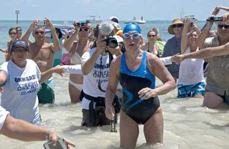 Con los labios hinchados, aturdida y quemada por el sol, la estadunidense Diana Nyad, de 64 años, se convirtió en la primera persona en cruzar las traicioneras aguas entre Cuba y Cayo Hueso, Florida, expuesta sin protección a los ataques de tiburones. La nadadora recorrió 177 kilómetros durante 53 horas, tras lanzarse al agua en La Habana.