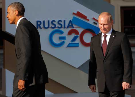 Las posturas divergentes de los presidentes Barack Obama y Vladimir Putin en torno a la crisis en Siria salieron a relucir en la inauguración de la cumbre del Grupo de los 20, en San Petersburgo. Estuvieron juntos menos de un minuto, al darse un apretón de manos como parte del protocolo Foto Ap