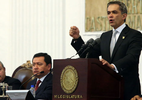 Miguel Ángel Mancera, jefe de Gobierno del Distrito Federal, afirmó, sin mencionar de manera directa a la CNTE, que la ciudad de México ha dado muestra de solidez y tolerancia. Subrayó: no rehuiré mis responsabilidades ni tampoco las consecuencias de mis decisiones. Al acto acudió Miguel Ángel Osorio Chong, secretario de Gobernación, en representación del presidente Enrique Peña Nieto Foto Francisco Olvera