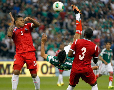 La selección nacional de futbol consiguió un agónico triunfo 2-1 sobre la escuadra de Panamá. El resultado permite al equipo mexicano aspirar aún a obtener el pase directo al Mundial de Brasil 2014. Los goles tricolores fueron marcados por Oribe Peralta al minuto 39, y al 85 por Raúl Jiménez, de chilena (en la imagen), mientras Javier Chicharito Hernández falló un penal Foto Ap