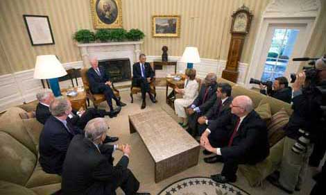 El presidente Barack Obama y el vicepresidente Joe Biden se reunieron con representantes demócratas en la Oficina Oval para analizar soluciones a la semiparálisis que sufre el gobierno federal. En el Senado, las bancadas reanudaron negociaciones para incrementar el techo de deuda y reactivar las agencias gubernamentales, luego de que la Cámara de Representantes fracasó en su intento de generar un nuevo proyecto. Los legisladores republicanos habían planteado la reapertura inmediata del gobierno hasta el 15 de diciembre y la emisión de deuda hasta el 7 de febrero, lo cual fue rechazado por la Casa Blanca. El plazo para que la administración estadunidense se declare en moratoria vence mañana Foto Ap