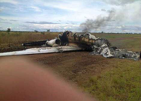 El jefe del comando estratégico operacional venezolano, Vladimir Padrino López, difundió en su cuenta de Twitter imágenes de la avioneta mexicana, con matrícula XBMGM, que fue destruida en el estado de Apure, fronterizo con Colombia. No informó sobre los tripulantes o su cargamento Foto tomada de Twitter