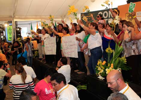 El método propuesto para elegir consejeros estatales desató la inconformidad de delegados en el 14 congreso nacional del PRD, realizado en Oaxtepec, Morelos. Un grupo de mujeres ocupó la tribuna para plantear crear una organización bajo lineamientos definidos en la asamblea, pero la propuesta fue desechada por Nueva Izquierda y sus aliados Foto José Antonio López