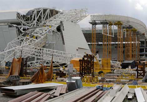 Una grúa chocó con una estructura metálica de unas 500 toneladas, que a su vez derribó una parte del muro exterior del estadio Itaquerao, ubicado en Sao Paulo y que pertenece al club brasileño Corinthians. Autoridades dijeron que el inmueble no sufrió daños estructurales mayores Foto Ap