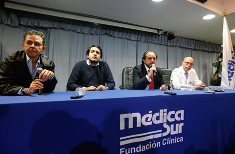 En la conferencia en Médica Sur para dar a conocer el estado de salud de Andrés Manuel López Obrador participaron César Yáñez, vocero del político tabasqueño; Andrés Manuel López Beltrán, y los médicos Patricio Ortiz Fernández (al micrófono), quien estuvo a cargo de la cirugía cardiovascular, y Octavio Gómez Foto Carlos Ramos Mamahua