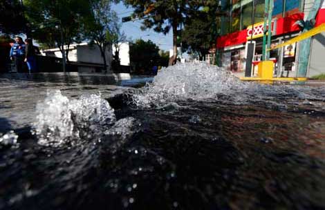Un tubo subterráneo que transportaba más de 2 mil metros cúbicos del líquido reventó en el cruce del Eje 6 Ángel Urraza y Amores, delegación Benito Juárez, debido a las obras que realizaba una empresa para la Comisión Federal de Electricidad. La fuga generó enorme congestión vehicular. Ramón Aguirre, director del Sistema de Aguas de la Ciudad de México, reconoció que el daño es grave y que la reparación dejará sin suministro a la colonia Del Valle Centro al menos dos días Foto Alfredo Domínguez
